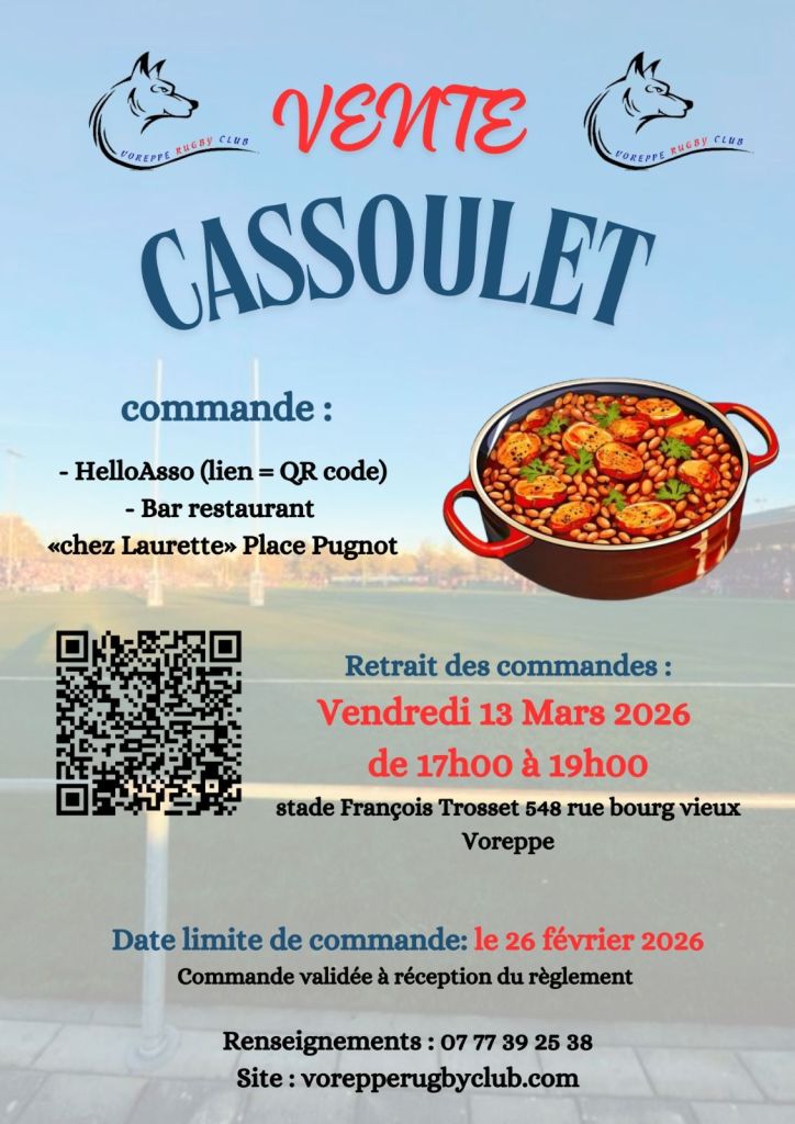 La commande devra être récupérée le vendredi 13 mars 2026 de 17 h à 19 h au stade de rugby.